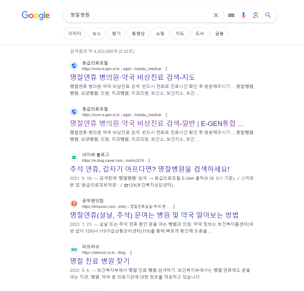 응급상황이 생기면 전화도 어느 때는 몰려서 연락이 잘 안 될 수도 있는데 그럴 때는 각종 포털사이트에 명절병원 이렇게 4글자로 검색해 봅니다. 그럼 응급의료포털사이트 주소가 나옵니다. PC에서 폰에서 모두 검색가능합니다.
