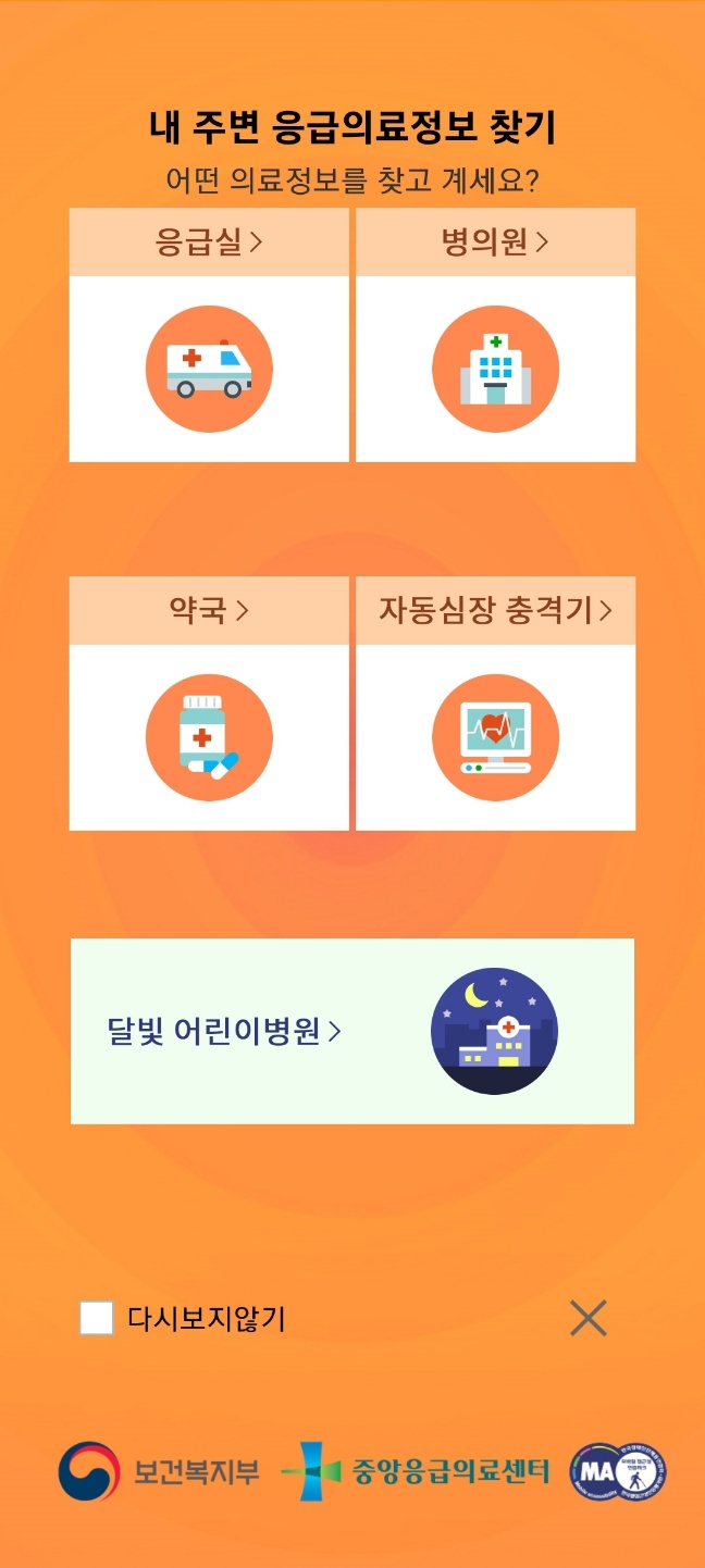 응급의료정보를 어플 검색했을 때 가장 먼저 보이는 화면입니다.