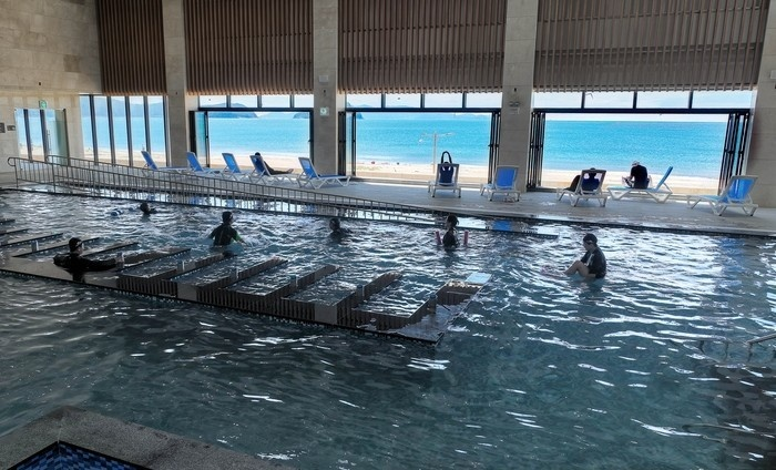 대표적인 시설이 있는 1층에는 가장 큰 규모의 해수풀 딸라소풀이 있습니다. 제주도의 한라산이 보입니다.수중 노르딕 워킹등 각종 수중 운동과 에어 버블을 통한 수압마사지 등 5개의 프로그램이 진행됩니다. 이를 통해 전신이완, 통증완화, 근육통 해소에 도움이 됩니다.