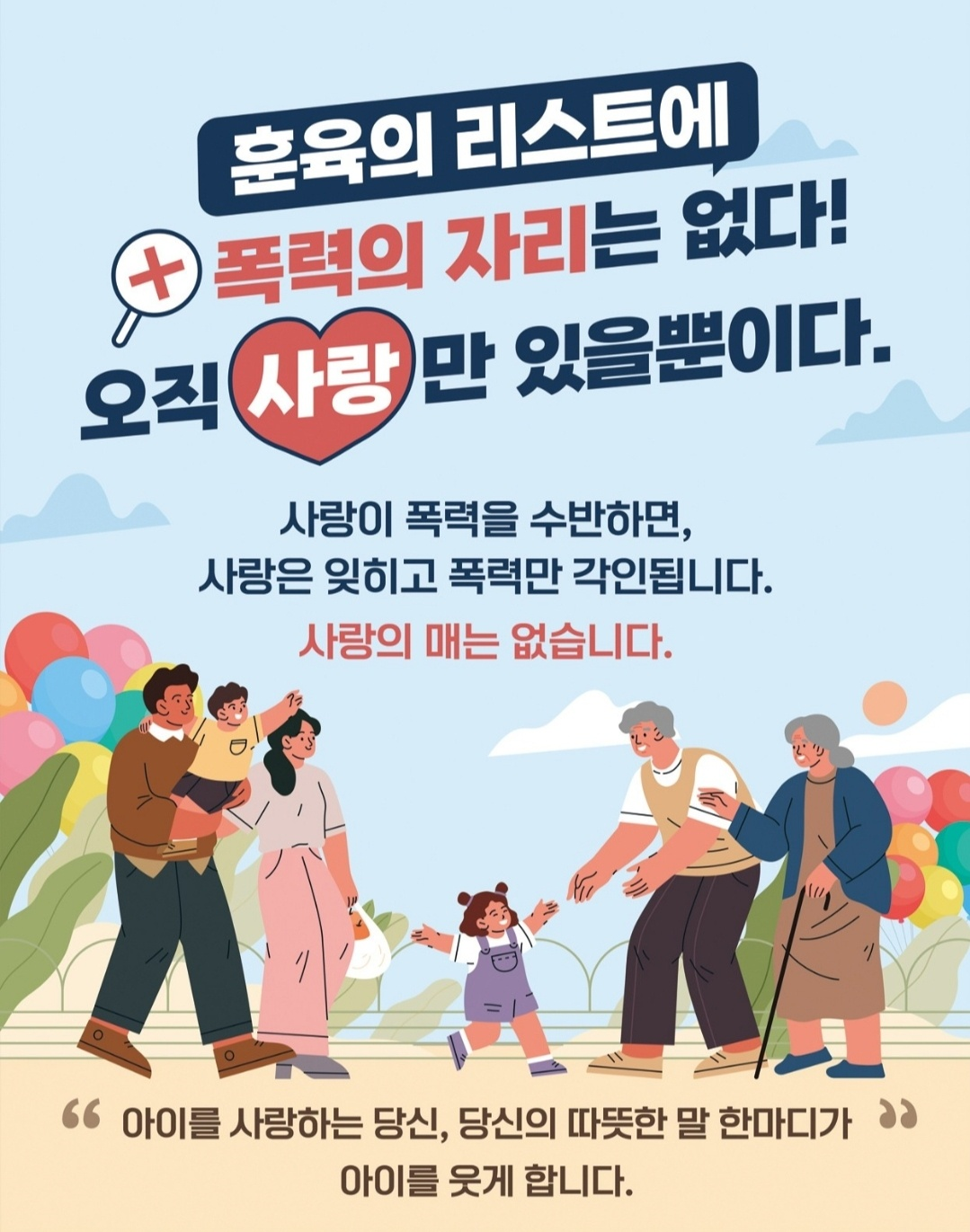 사랑해서 훈육했다? 사랑하기 때문에 사랑의 매를 들었다? 거짓말하지 마세요. 모두 비겁한 변명이고 자기 편하자는 자기 합리화에 불과합니다.폭력은 또다른 폭력을 낳고 대물림되기도 합니다. 반드시 없어져야 합니다.