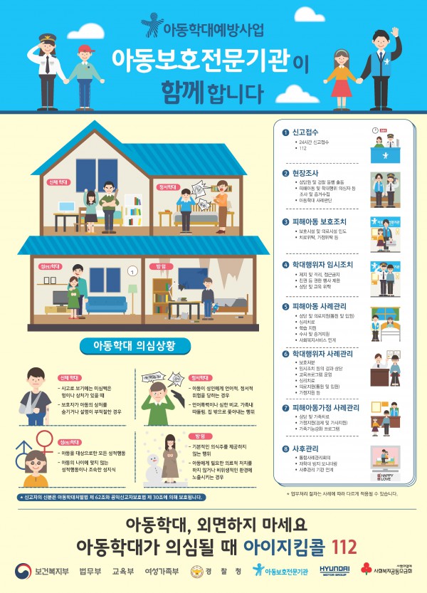 신고 후 진행 과정 절차는 위 포스터와 같습니다. 신고접수를 시작으로 관계기관에서 현장조사가 이뤄지며 피해아동은 즉시 보호조치 시행됩니다. 또한 학대행위자는 임시조치가 이뤄지며 피해아동의 사례를 알아보며 다방면으로 관리를 받게 됩니다. 학대행위자 역시 상황에 따른 사례관리가 진행됩니다. 조사를 통해 학대받은 아동의 가정 또한 남겨진 아동이 있다면 상담과 지원을 받게 됩니다. 여기서 그치지 않습니다. 무엇보다 사후관리가 중요합니다. 철저한 사후관리를 통해 계속 모니터링을 시작합니다.(사례에 따라 업무처리는 다르게 적용될 수 있다고 합니다.)