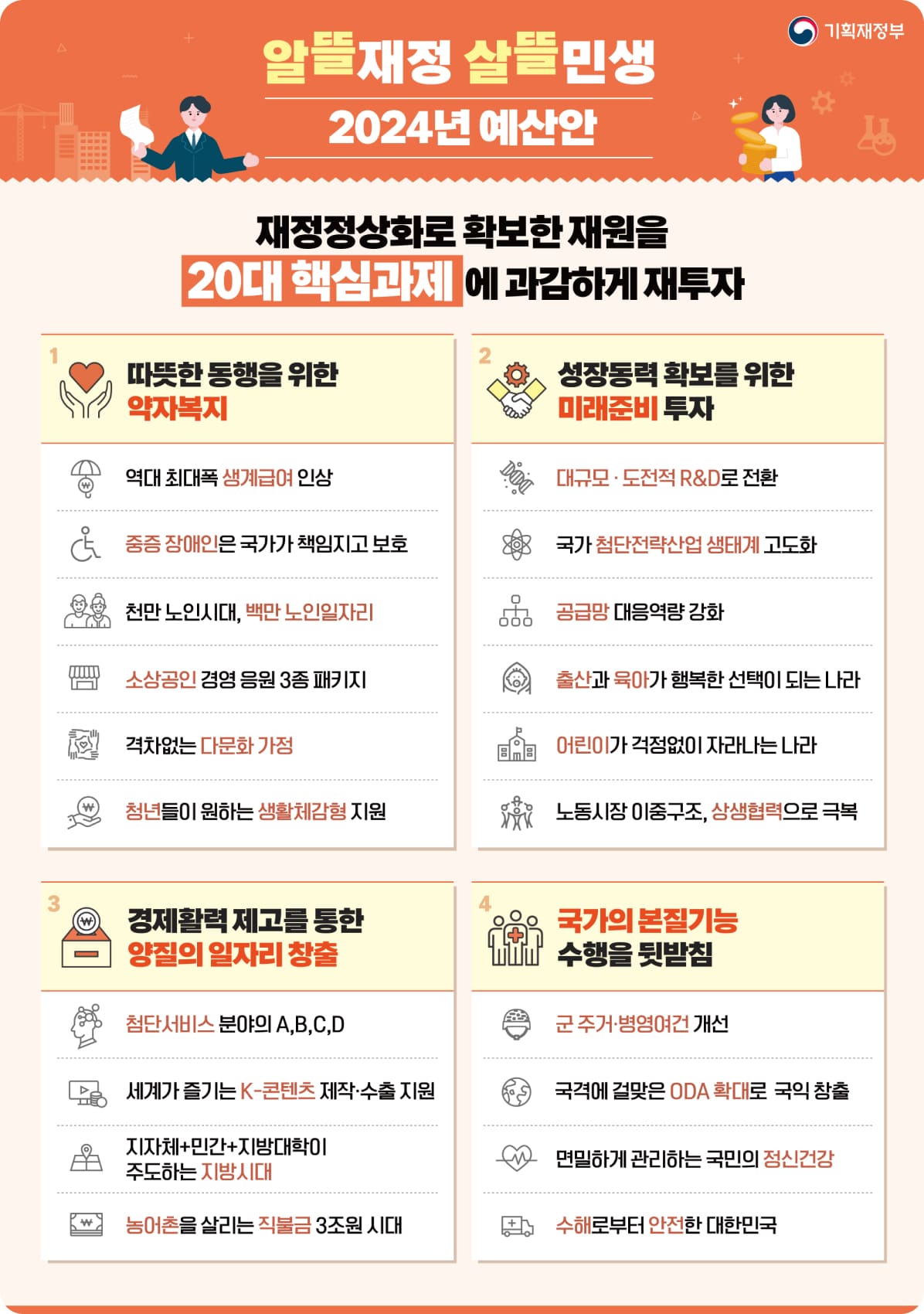 알뜰재정 살뜰민생이라는 슬로건을 걸고 2024년 예산안을 발표한 만큼 그대로 꼭 지켜지길 바랍니다. 자료를 제공해 준 기획재정부에 감사를 드립니다. 읽어주셔서 감사합니다.대한민국 화이팅!!