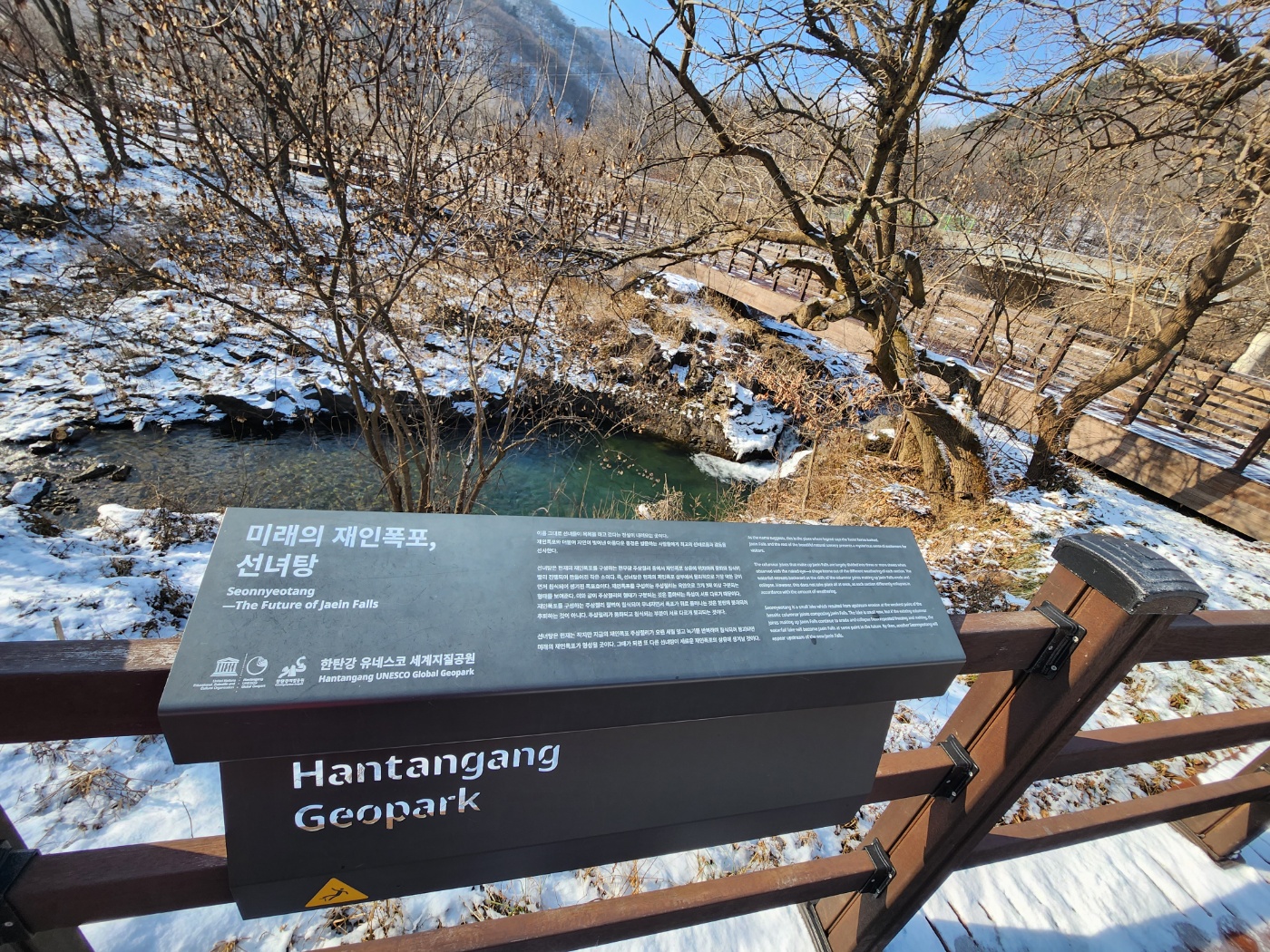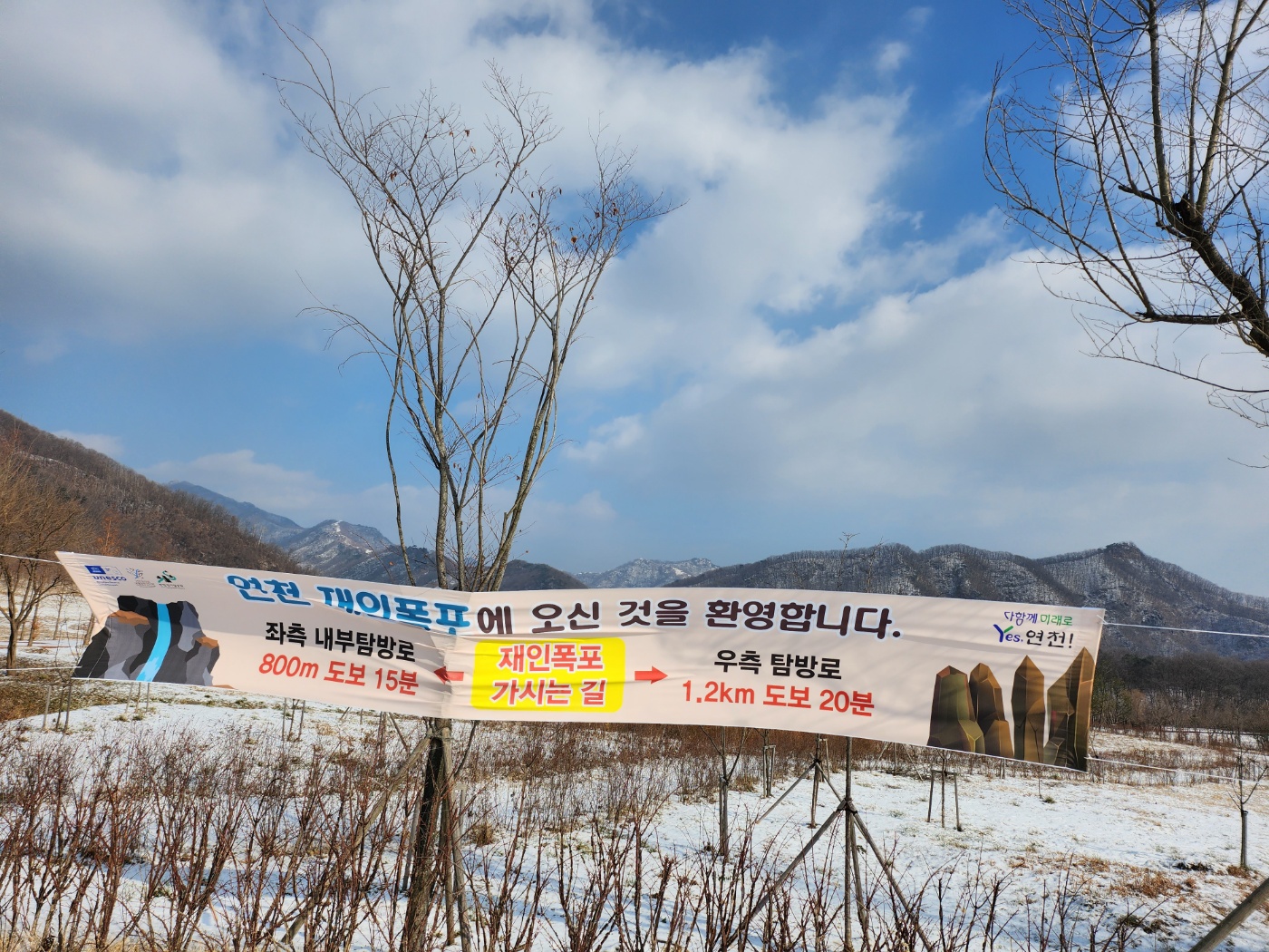재인폭포 가까이 가니 여기라고 마치 알려주는 듯한 입구가 보였어요. 두근두근~ 비록 날씨는 추웠지만 맘 먹고 온 거라 그냥 돌아갈 수는 없었답니다.