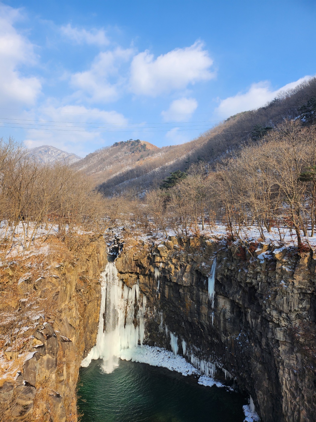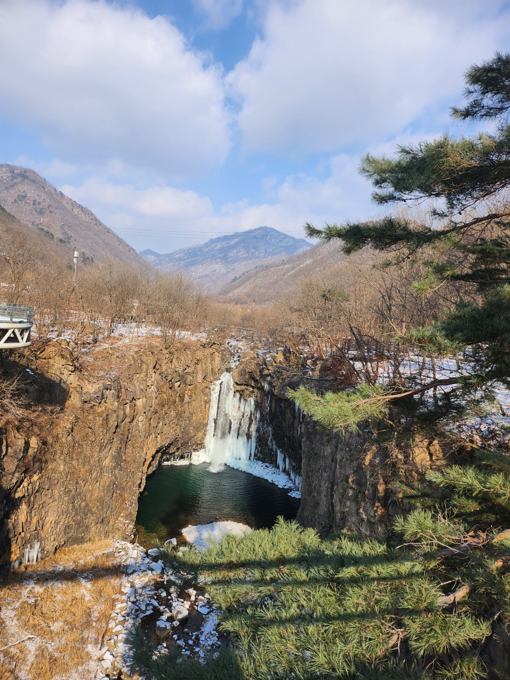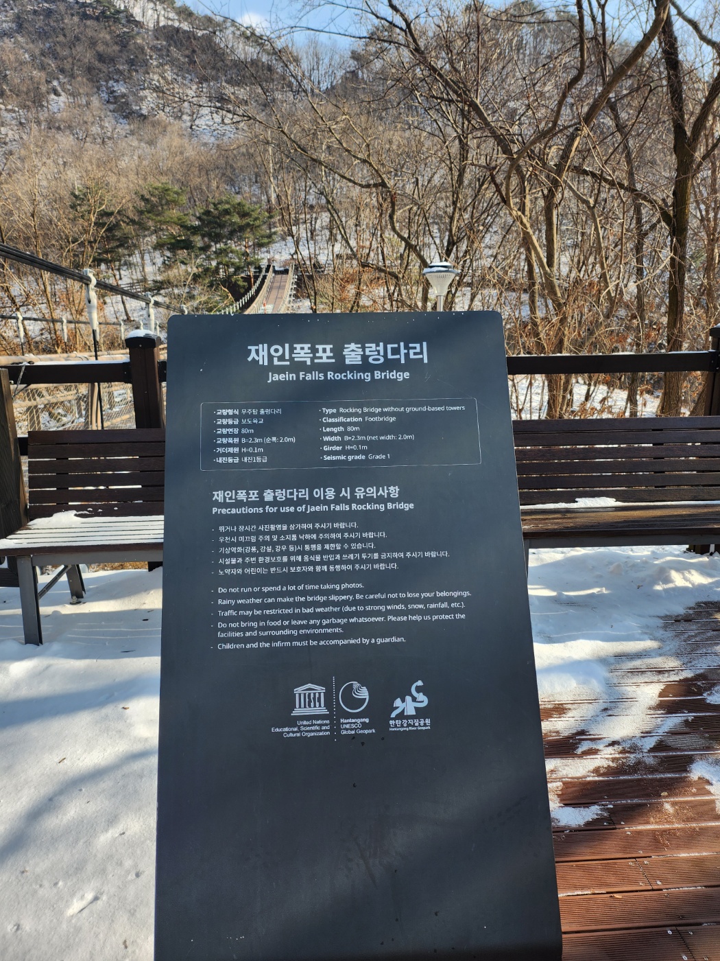 중간까지 걸어가다 만난 재인폭포는 우와~장관이네요. 얼어있어도 흐르는~폭포는 정말 아름다웠어요. 남아있는 출렁다리를 건넜어요.
