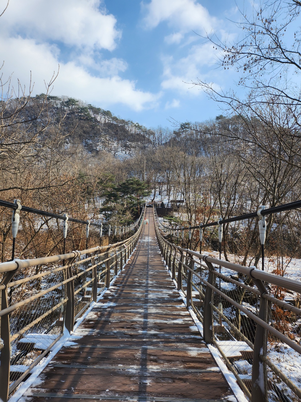 이런저런 얘기들을 하면서 걸었더니 재인폭포 출렁다리가 나오더라고요. 미끄러울까 봐 조심조심하면서 건너봤어요. 건너면서 보니까 정말 출렁~출렁~흔들~흔들~하더라고요. 살짝 스릴 있으면서도 혹시 모를 불안감에 떨리기도 했답니다.