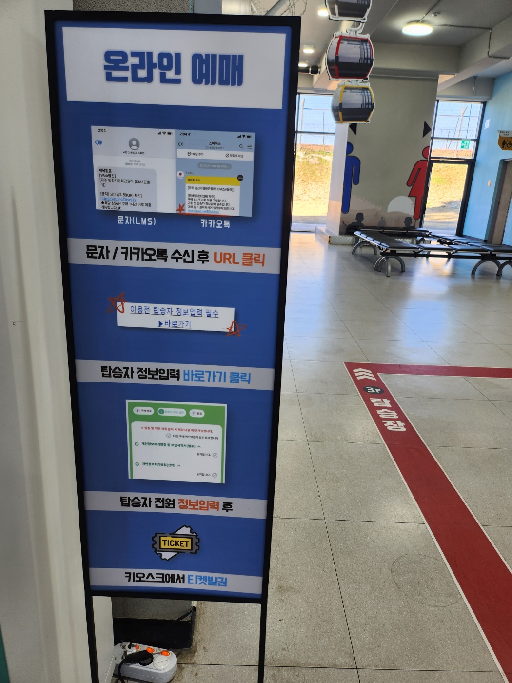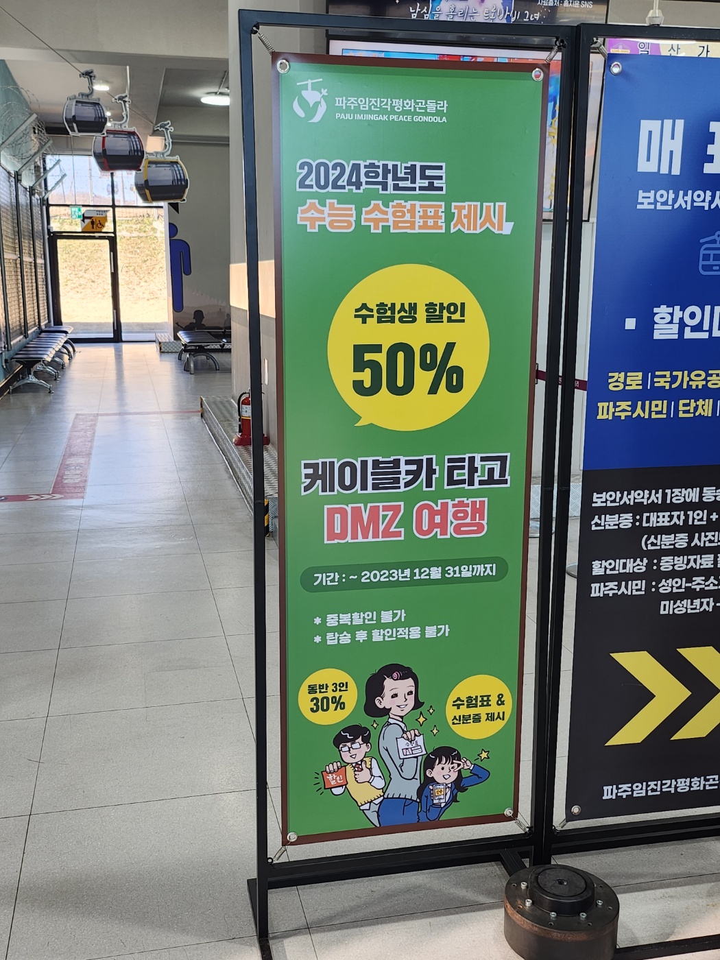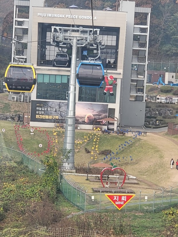 저는 가장 눈에 띈게 있었는데요. 바로 민통선구간을 오가는 세계 유일의 민간인 통제 구역 곤돌라였어요. 시간이 허락된다면 타봤을 텐데 아쉬움을 남겨야 다음에 또 갈 수 있을 거라서 다음을 기약하기로 했답니다. 총 1.7km 길이의 임진각 평화 곤돌라를 통해 가장 빠르고 가장 편안하고 가장 쉽게 민통선을 방문하는 방법이기도 합니다. DMZ 하늘길을 지나서 임진강을 통해 남과 북을 자유롭게 오고 가며 임진강 전망대와 옛 주한미군 시설을 탈바꿈한 갤러리 그리브스까지 관람할 수 있습니다. 곤돌라도 바닥이 투명한 것과 불투명한 것을 골라 탈 수 있습니다. 12월 31일까지 2024 수능 수험표 제시하시면 본인 50% 동반 3인까지 30% 할인 해준다고 합니다.