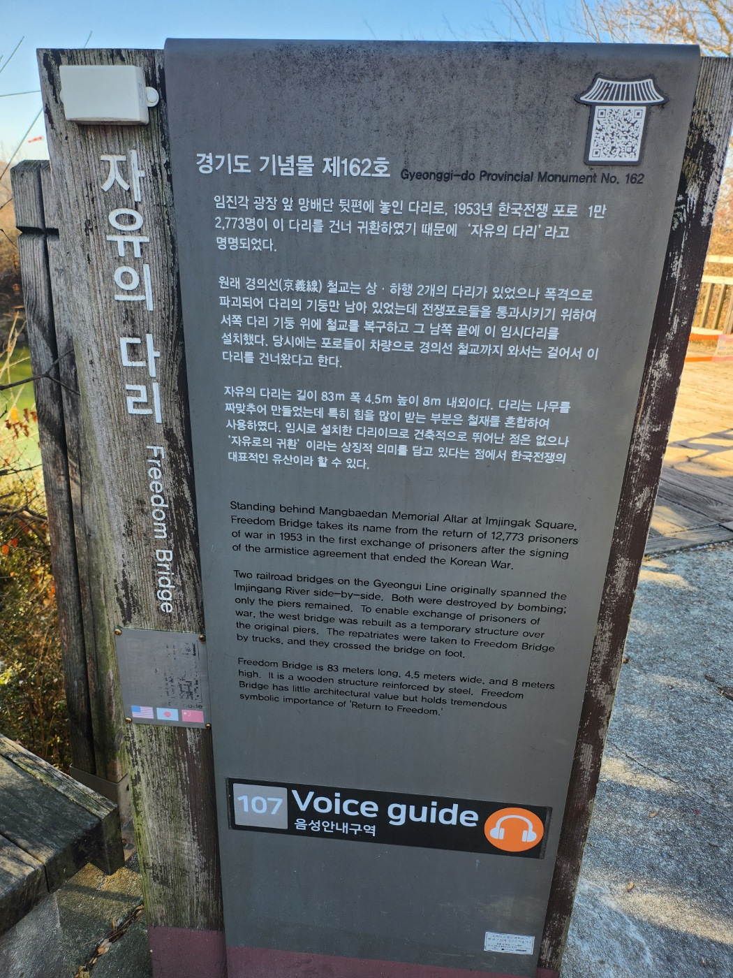평화의 종은 21세기를 상징하는 뜻에서 21톤의 무게에 21계단으로 만들어졌다고 합니다. 자유의 다리는 경기도 기념물 제162호로도 지정이 되었는데 1953년 당시 12,773명의 한국포로의 교환을 위해 가설한 다리입니다. 당시 포로들은 차량으로 경의선 철교까지 온 후 이 다리를 걸어서 건넜다고 해서 붙여진 이름이라고 합니다. 북에 고향을 둔 실향민들은 얼마나 가족이 보고 싶겠어요. 그래서 그분들 고향과 조금이라도 가까운 곳에서 조상들을 추모하라고 망배단도 만들어 두었다고 합니다.