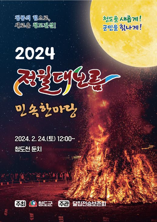정월대보름에 하는 놀이로는 쥐불놀이, 강강술래, 줄다리기, 달집 태우기, 달맞이, 답교놀이(다리밟기), 더위 팔기, 윷놀이 등이 있습니다. 각 지자체에서 주최해서 지역별로 정월 대보름 행사를 개최하기도 합니다. 한 예로 청도 대보름 행사가 있어서 포스터로 소개해 드립니다. 가까이 사시는 분은 참석하셔서 좋은 경험 하시기 바랍니다.