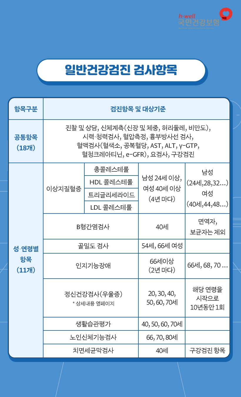 일반검진 중에서도 공통적으로 받을 수 있는 검진과 연령에 따라 받을 수 있는 내용이 다릅니다. 밑에 표 참고해 주세요.