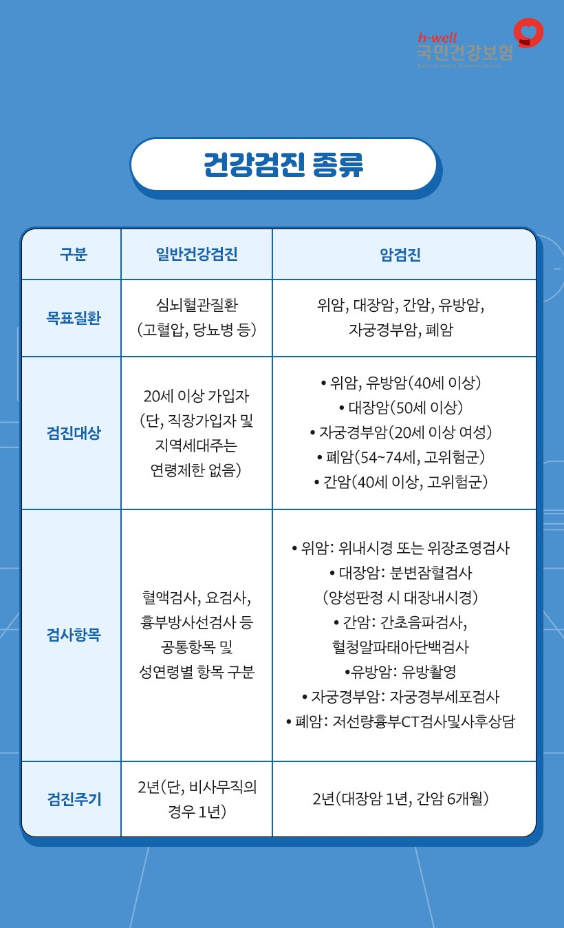 국가건강검진은 일반건강검진과 암검진으로 구분합니다. 일반건강검진은 혈압, 혈액검사, 공복혈당, 흉부방사선 촬영등이 있으며 암검진은 위암, 간암, 대장암, 유방암, 자궁경부암, 폐암 등 6가지 항목입니다.