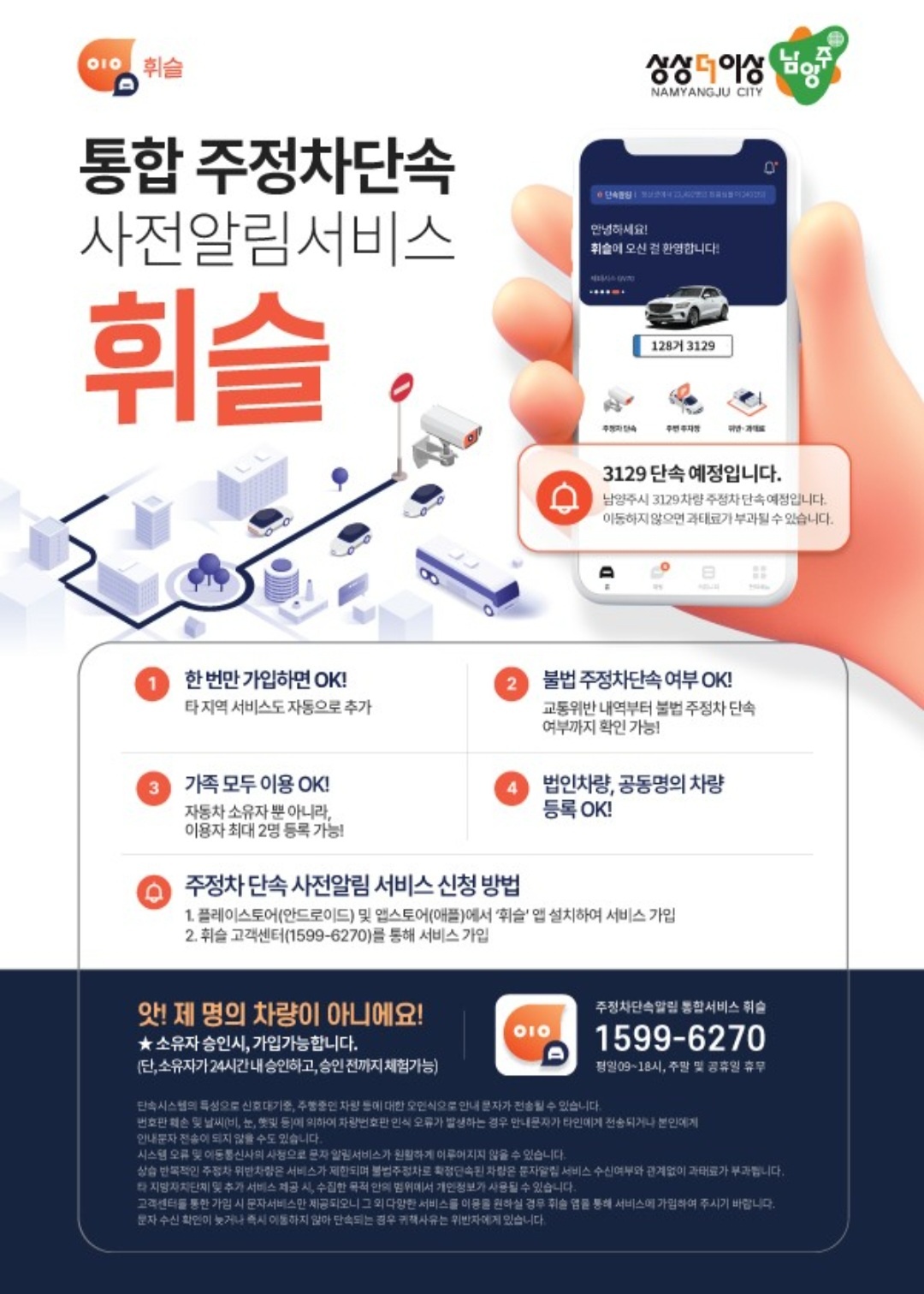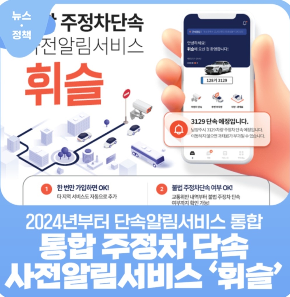 2024년 1월 1일부터 남양주시에서 제공 중인 주정차 단속 사전 문자 알림 서비스가 통합 주정차 단속 알림서비스 '휘슬'로만 운영됩니다.