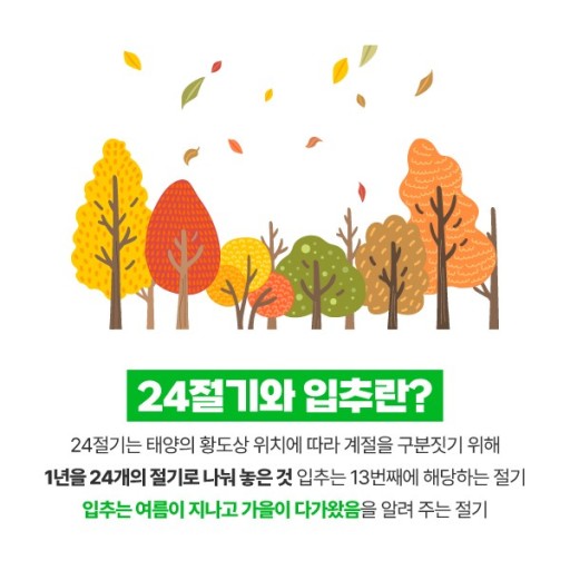 입추는 우리나라 24 절기 중에서 13번째에 해당하는 절기입니다. 한자를 보면 立秋 설립에 가을 추해서 가을에 든다라고 합니다. 여름이 끝나고 가을이 온다는 얘기이기도 합니다. 이 시기는 늦더위가 막바지 시기이기도 하고 가끔은 밤에 견딜만한 기온으로 바뀌기도 합니다.
